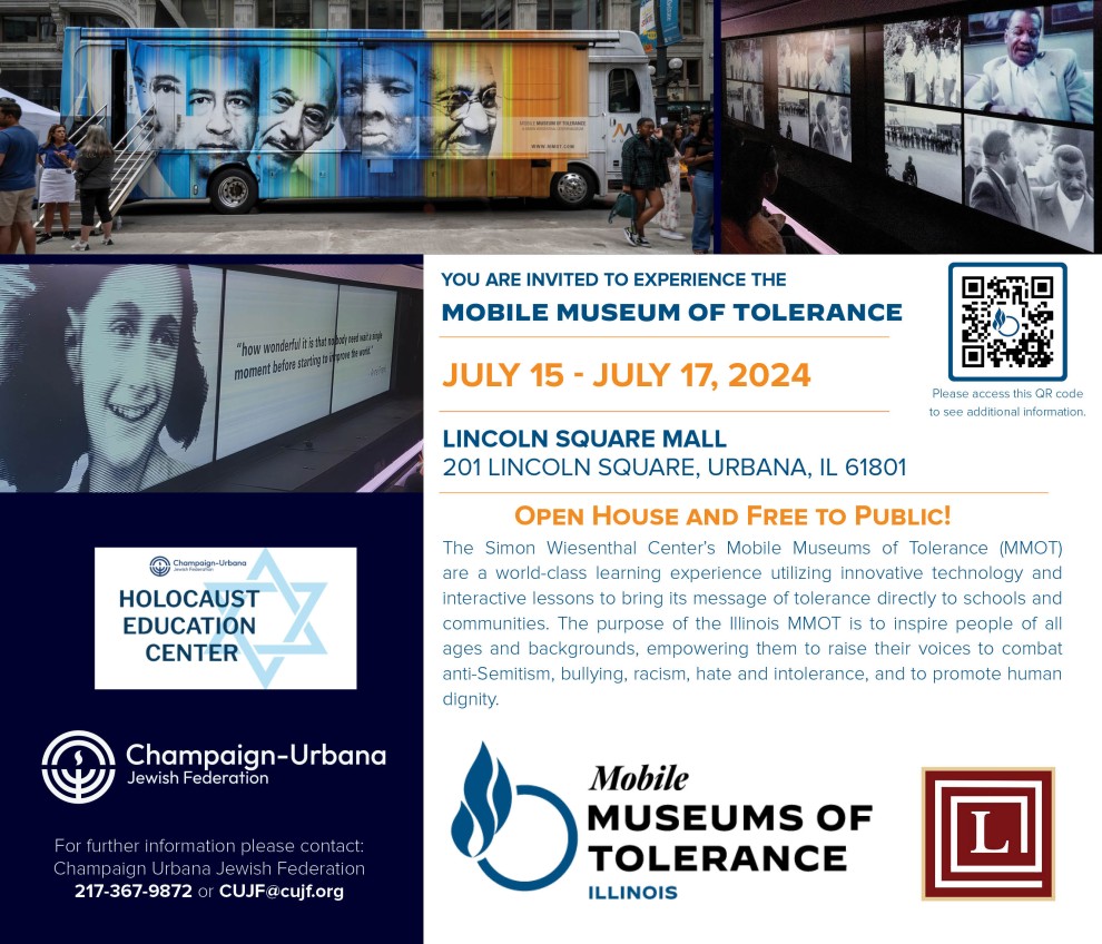 In partnership with the Holocaust Education Center and Lincoln Square Mall, the Mobile Museum of Tolerance will be joining us in July! As an arm of the Simon Wiesenthal Center, the MMOT is the first traveling education center of its kind in the United States and visits school districts and public places across Illinois to offer free education and awareness about the very real threat of hate and intolerance in our communities.