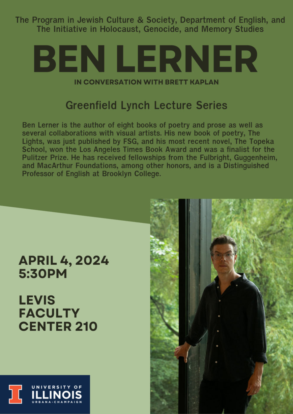 Please join us on April 4th at 5:30pm in 210 Levis for a conversation/reading with Ben Lerner. This is part of the Greenfield Lynch series organized by the Program in Jewish Culture & Society, The Department of English, and the Initiative in Holocaust, Genocide, Memory Studies. We are incredibly grateful to Deborah Lynch for this exciting lecture series which has brought Nicole Krauss, Sarah Phillips Casteel, Steven Zipperstein, James Friedman, and others to campus.