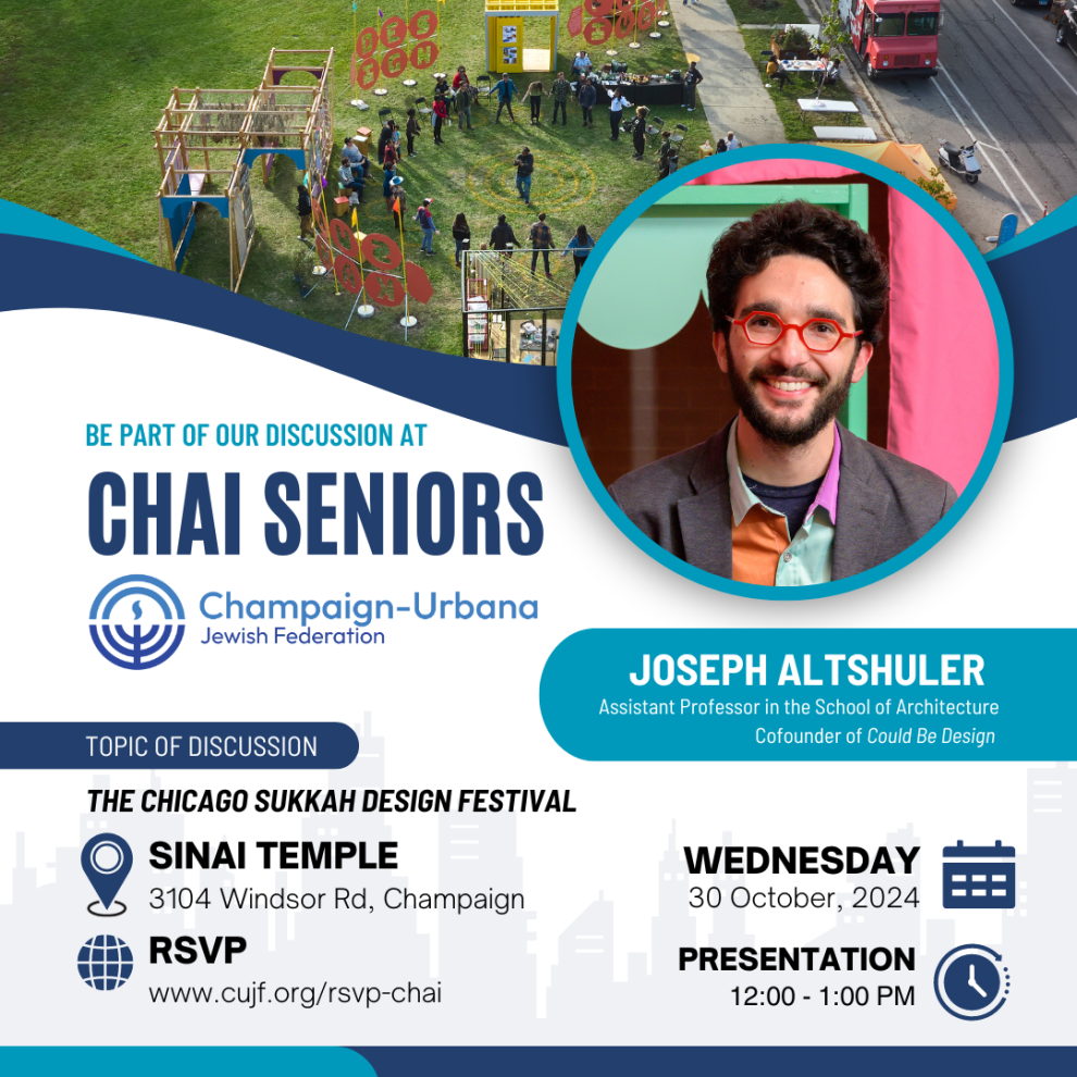Join us on Wednesday, October 30th from 12:00 - 1:00 PM at Sinai Temple for lunch from Maize and hear Joseph Altshuler share about the 2024 Chicago Sukkah Design Festival taking place in October! This year, the festival will have Sukkahs designed and built by five different community organizations in the Chicago Lawndale neighborhood. After the festival, this years Sukkahs will be permanently installed into the organizations' community centers and used for their programming.