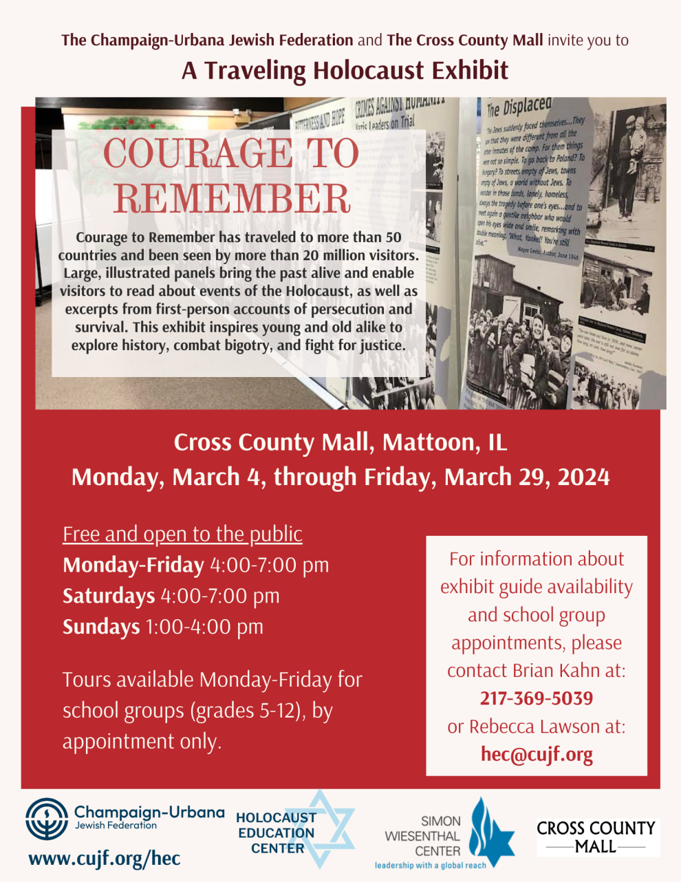 The CUJF and Cross County Mall in Mattoon invite you to come see Courage to Remember, a traveling Holocaust Exhibit.