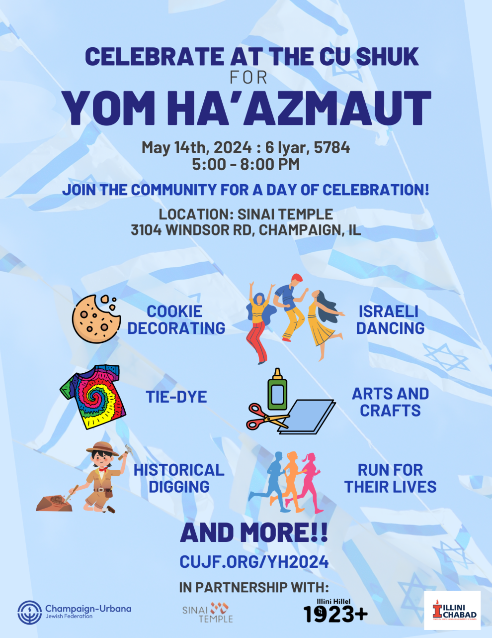 Join our community for a day of celebration and fun! We thank our partners Sinai Temple, Illini Hillel, and Illini Chabad. This year, we will be celebrating Yom Ha'azmaut, Israeli Independance Day, with the C-U Shuk. This will include lots of crafts, interactive educational experiences, and active sports like running with Run For Their Lives and Gaga in the Gaga pit!