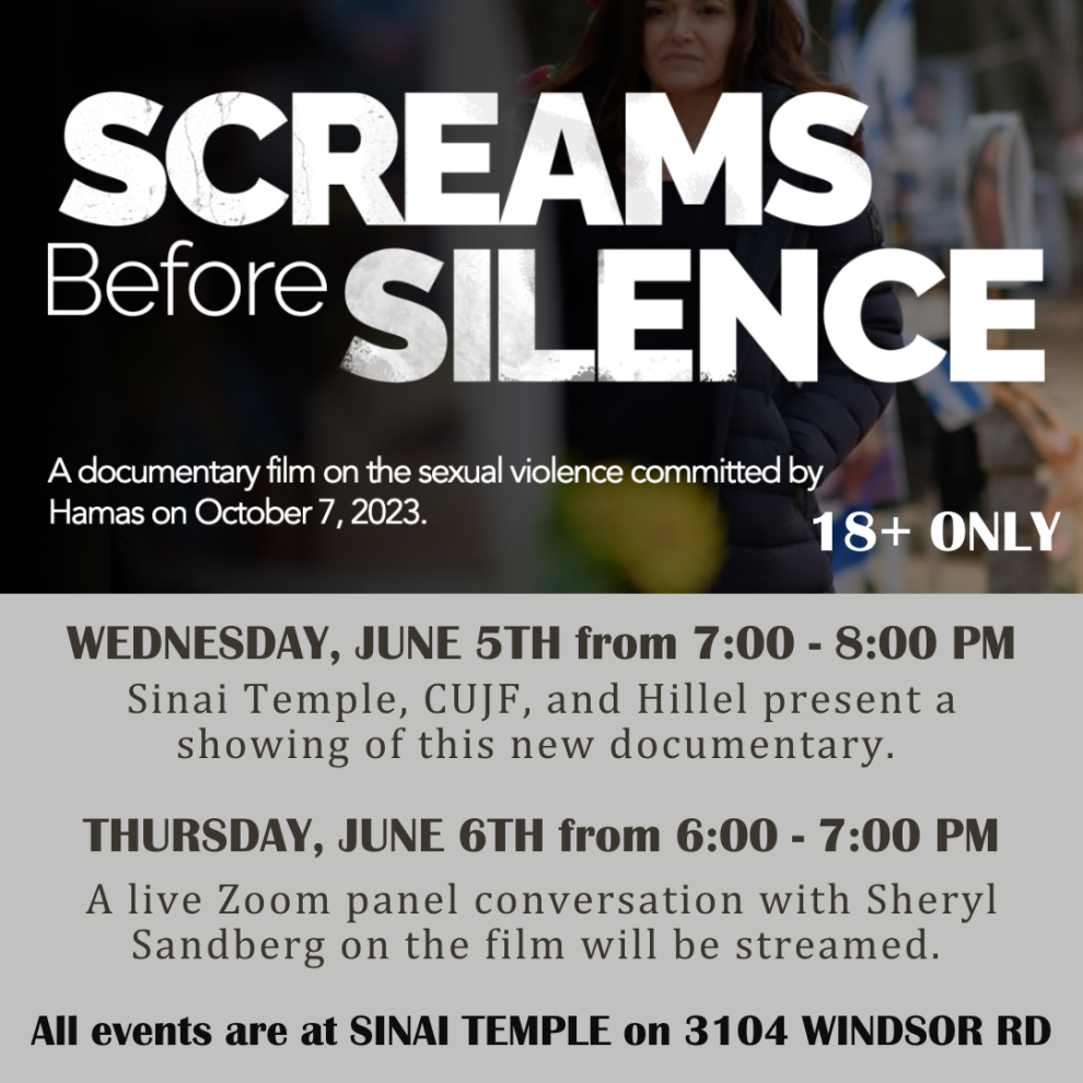 Wednesday, June 5, at 7 PM, Sinai Temple, CUJF, and Hillel will present a showing of the new documentary “Screams Before Silence” about the October 7 attacks. The film, approximately one hour long, documents the atrocity of the attacks with first-person testimony from survivors, first responders, eyewitnesses, released hostages, forensic experts, and advocates.