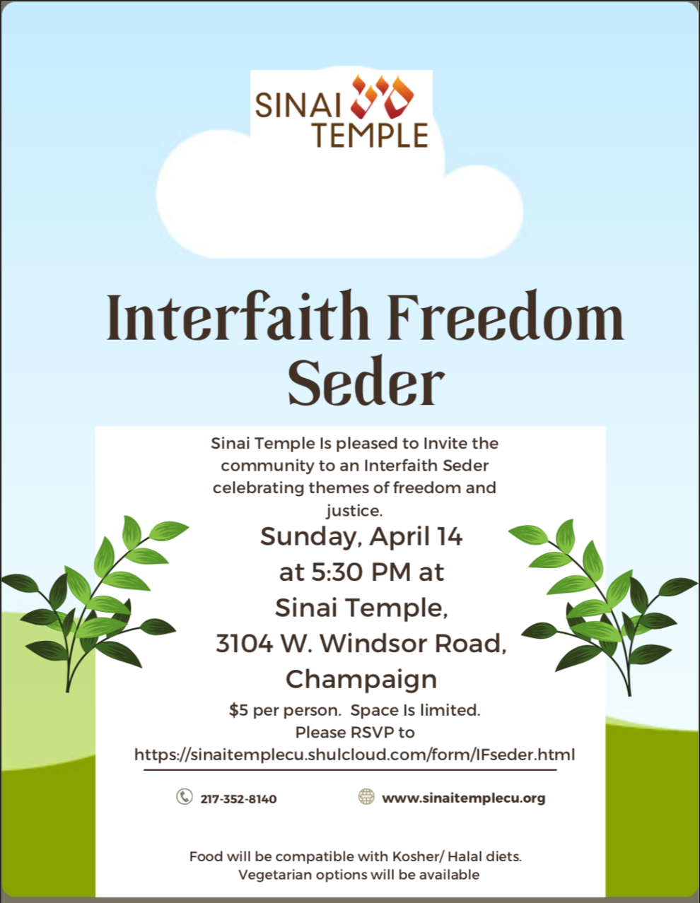 Sinai Temple will hold our Interfaith Seder. After a few years’ hiatus, this popular event is back. We will welcome members of other local faith communities for a pre-Passover event focusing on celebrating peace and freedom. We will enjoy a meal and a creative seder ritual drawing from a number of cultural and religious traditions. Space is limited; please register at https://sinaitemplecu.
