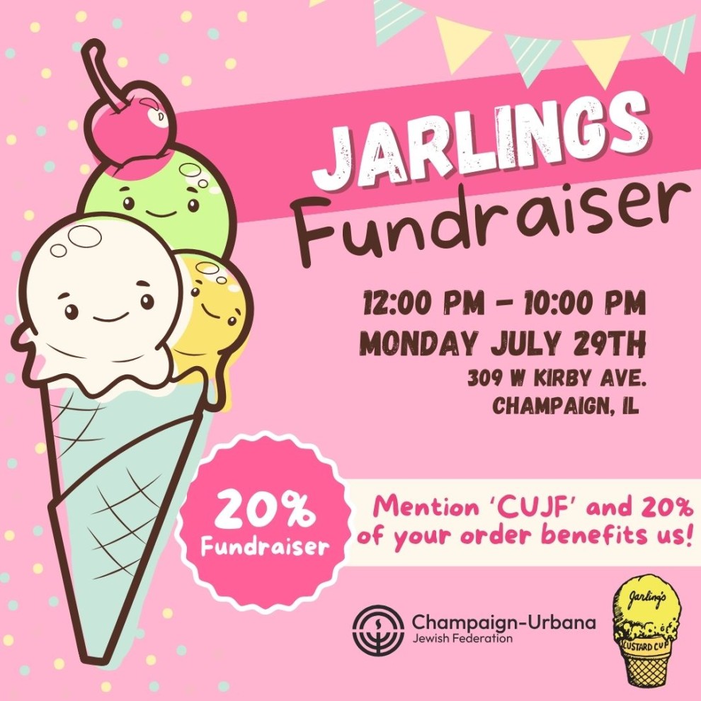 Join us for the tastiest fundraiser of the summer! On Monday, July 29th from 12:00 - 11:00 PM, every time you make a purchase at Jarlings Custard Cup and mention the Champaign-Urbana Jewish Federation, 20% of the proceeds from your order go to us! This is an easy way to support your local Jewish community while also eating a tasty treat.