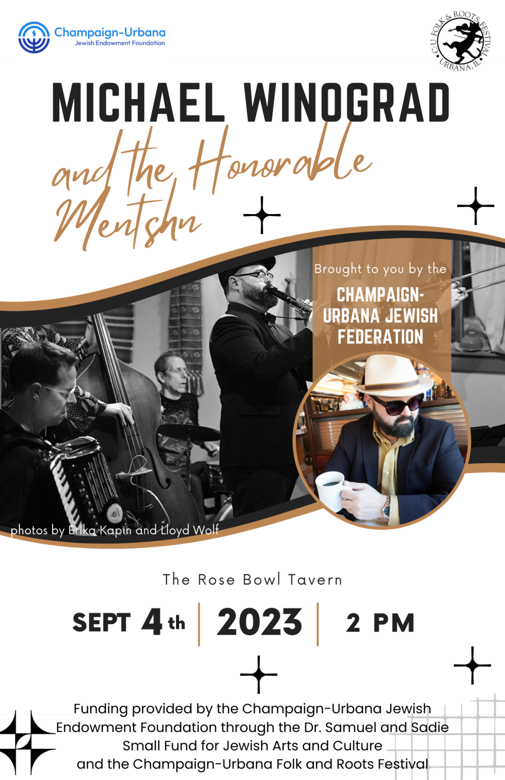 This program is brought to you by the Champaign-Urbana Jewish Federation and the CU Folk and Roots Festival, with additional funding provided by the Champaign-Urbana Jewish Endowment Foundation through the Dr. Samuel and Sadie Small Fund for Jewish Arts and Culture.