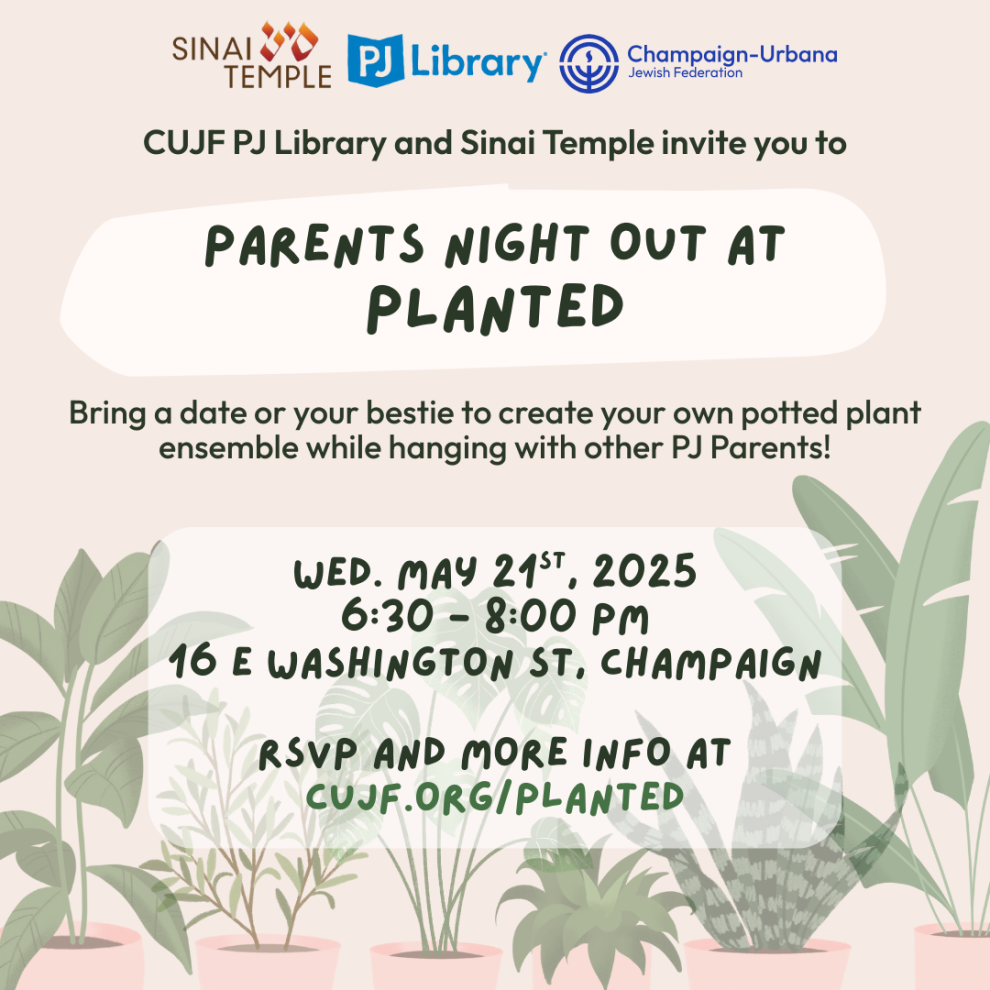 Take a well-deserved break and join PJ Library on May 21st, 2025 for a relaxing Parents’ Night Out at Planted, Champaign’s local plant store.