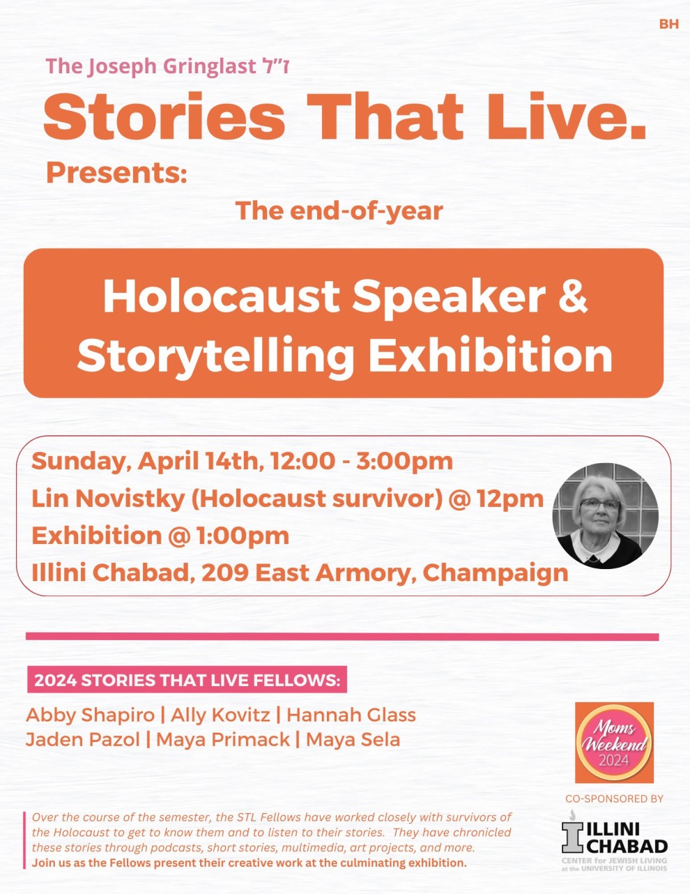 Come and hear Holocaust Survivor Lin Novistky speak about her experience at 12P, followed by an Exhibition created by the Stories That Live fellows. Over the course of the semester, the STL Fellows have worked closely with survivors of the Holocaust to get to know them and to listen to their stories. They have chronicled these stories through podcasts, short stories, multimedia, art projects, and more.