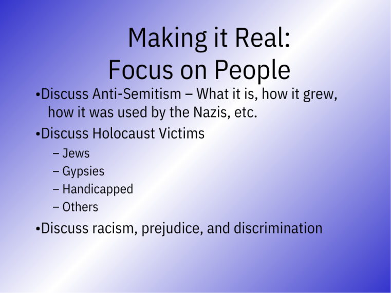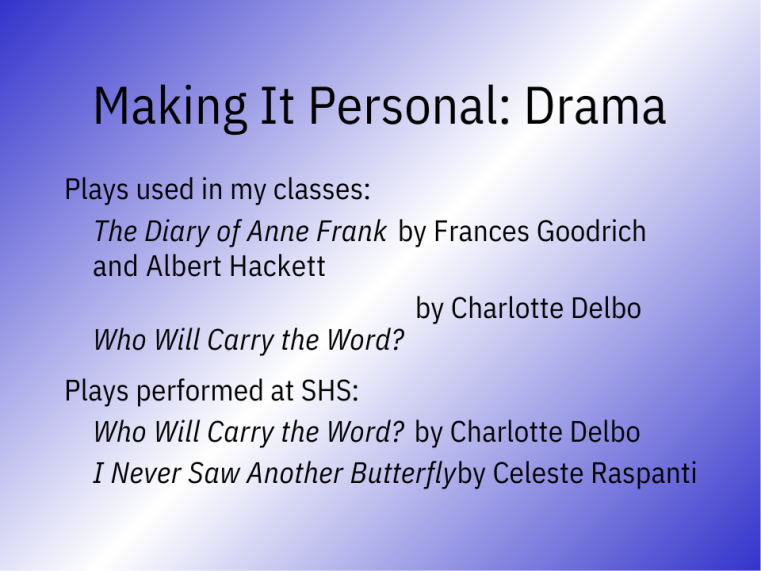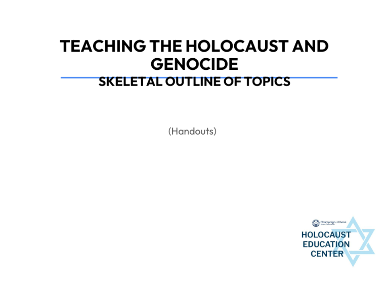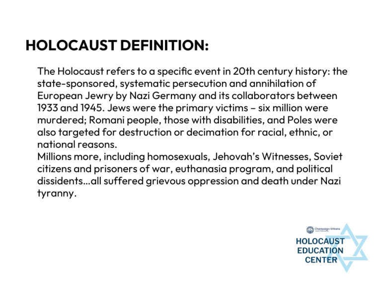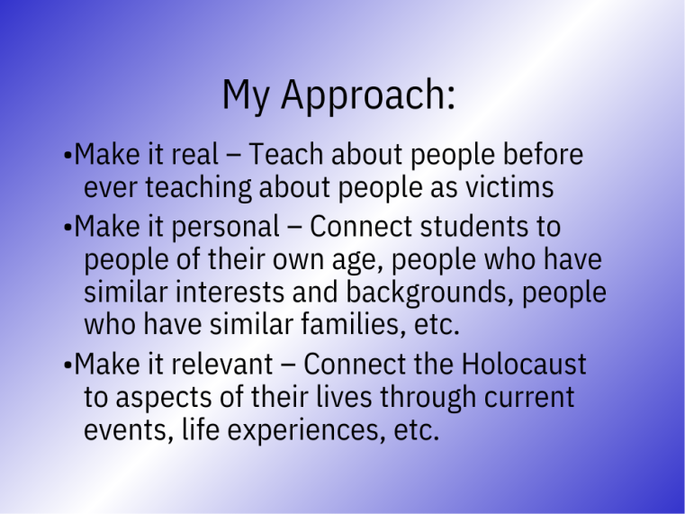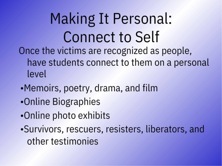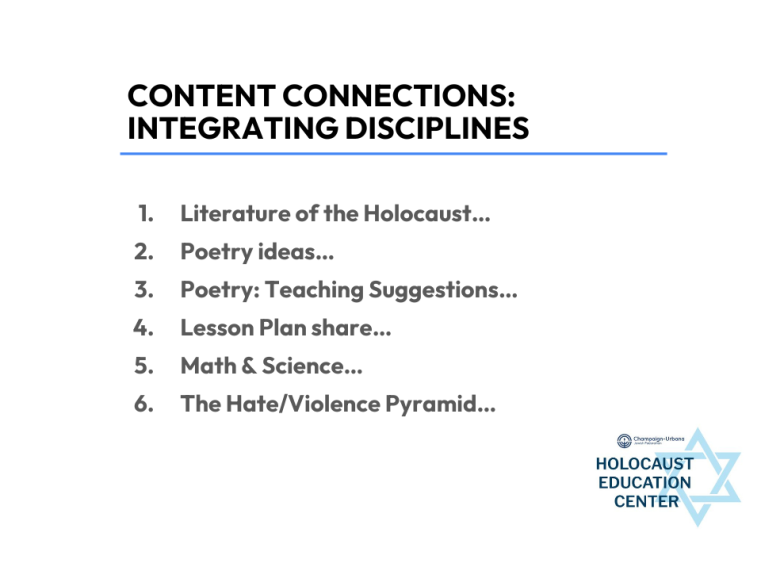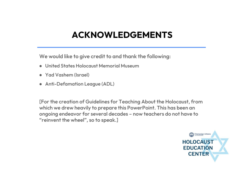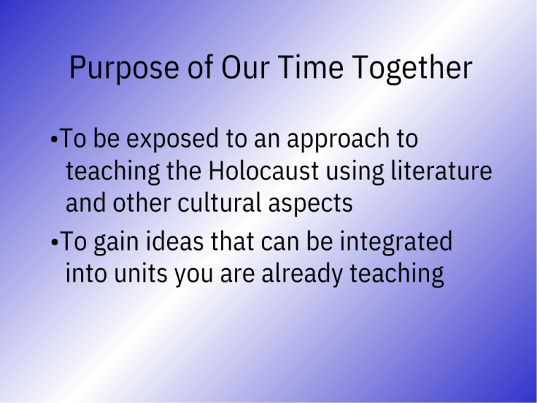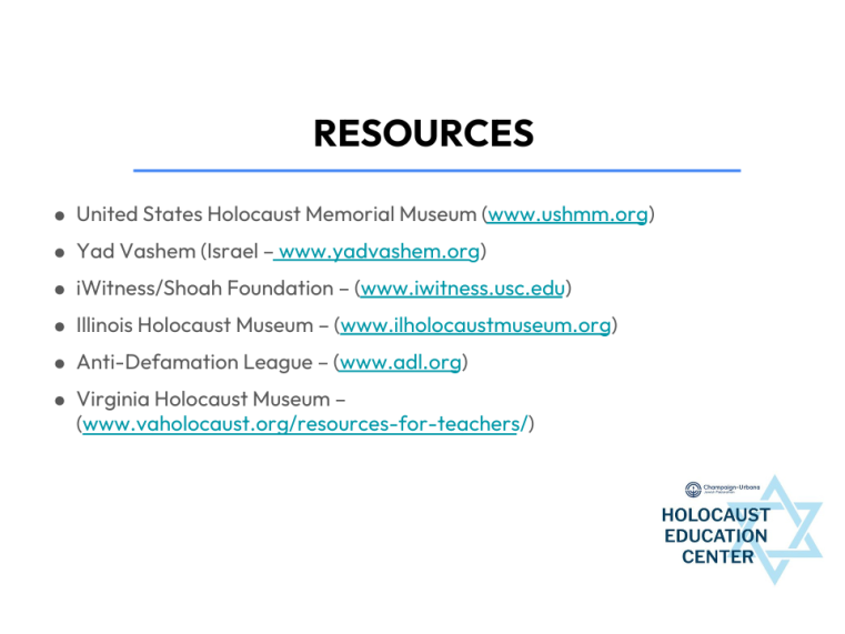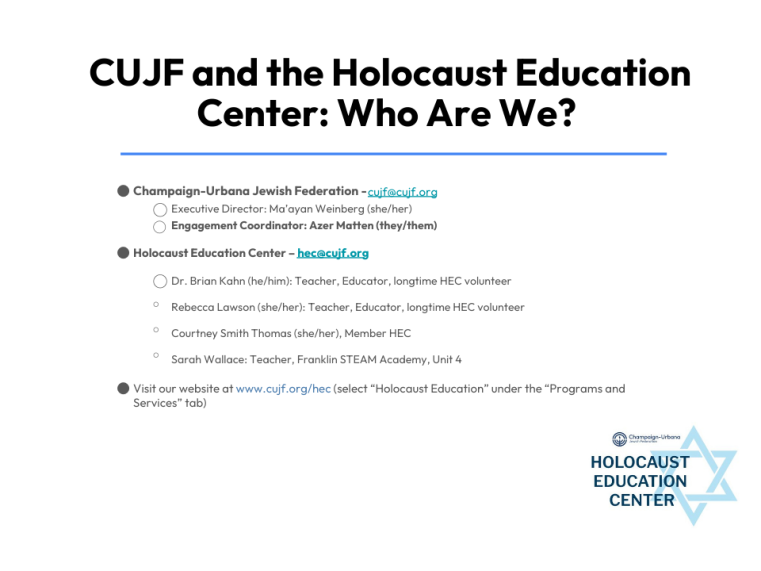 You can find the slides from the powerpoints shared during the Unit 4 PD presentations on October 10th. These slides discusses how we teach the Holocaust and best practices and materials to use during the units. The first presentation is from Dr. Brian Kahn, and the second is from Ms. Rebecca Lawson.