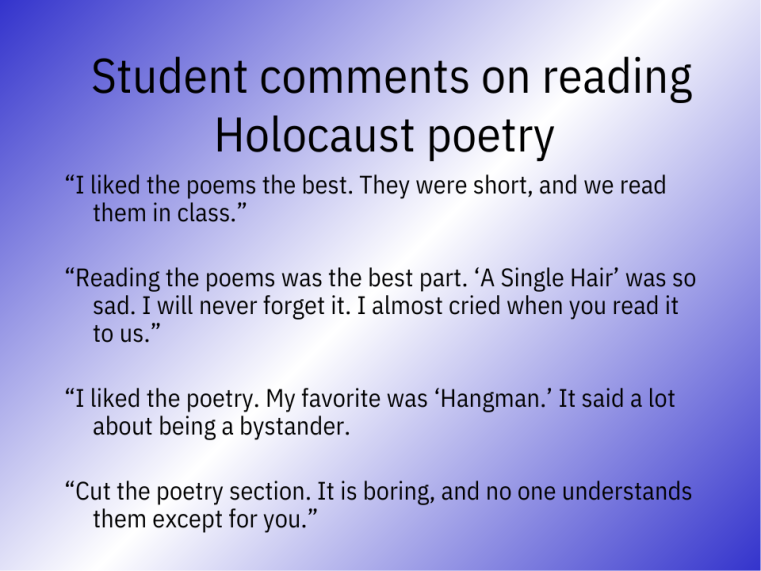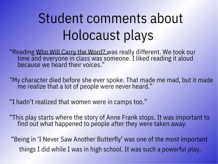 My name is Tamra Gingold, and I am the Orchestra Director at Urbana High School. I have always been an advocate for exposing my students to a broad range of culture by using music. I decided to do a unit on the Holocaust, focusing on the music, artwork, and poetry of Terezin, knowing that I would only be able to touch the surface as there was so much information and several of my students knew absolutely nothing about it except that it happened. In addition to researching the music, artwork, poetry, and prisoners of Terezin, students got the opportunity to hear from survivors of the Holocaust, including my dad, Dr. William Gingold. They learned how to play several melodies from songs composed in Terezin as well as songs written in remembrance of the 12 million+ souls whose lives were ended because of hate, ignorance, and fear.