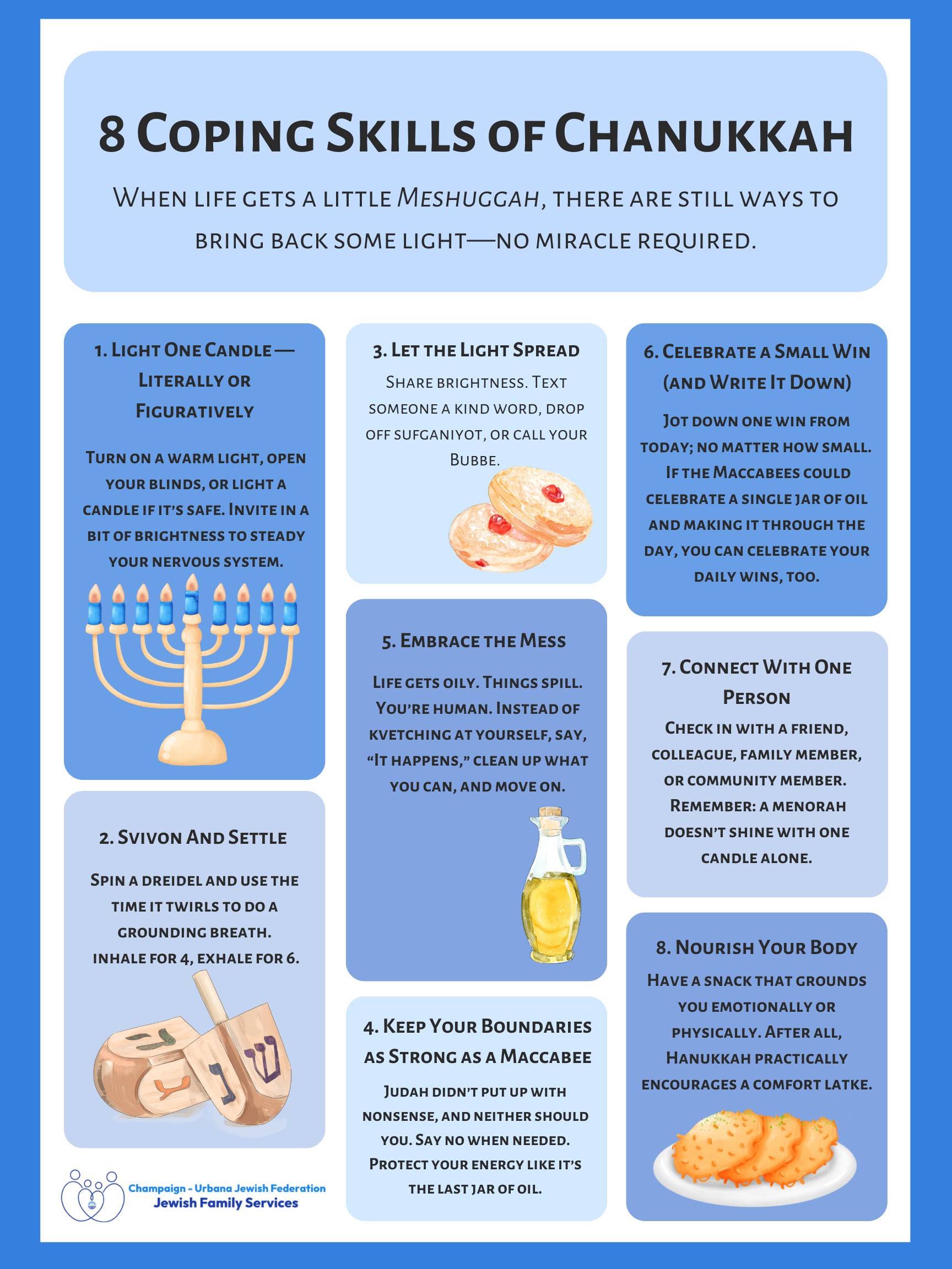 Chanukkah reminds us that resilience is built through repetition, not perfection. Lighting the candles happens night after night, even when the days are hard. In the same way, these coping skills are simple actions you can return to when things feel heavy. Sometimes resilience looks like taking a breath, setting a boundary, reaching out, or just getting through the day. One candle at a time, one day at a time, that is enough.