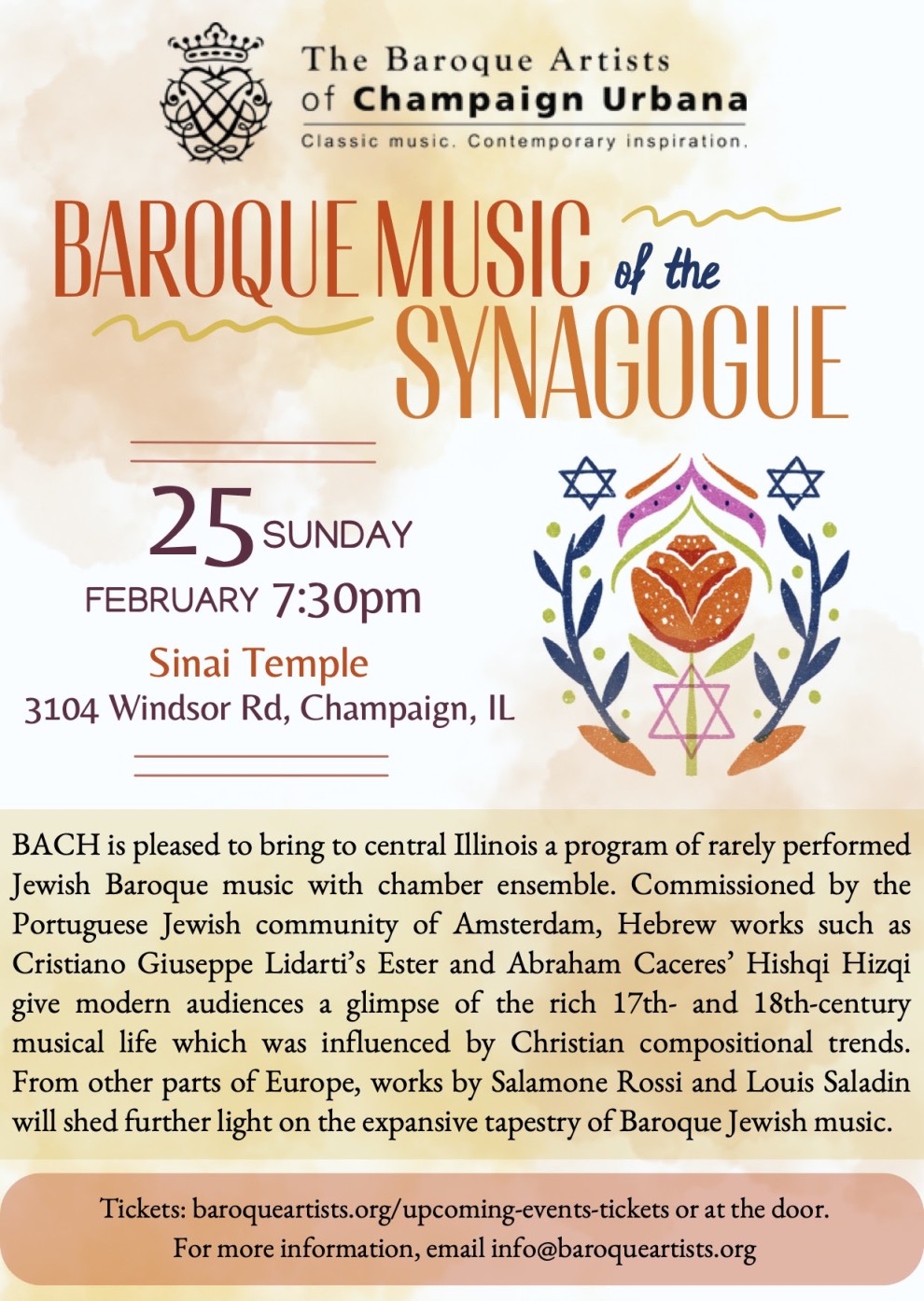 We are excited to share you our upcoming concert with the Baroque Artists of Champaign Urbana on February 25th at 7:30 (Sinai Temple, Champaign) and hope you will be able to come! Here is some information: