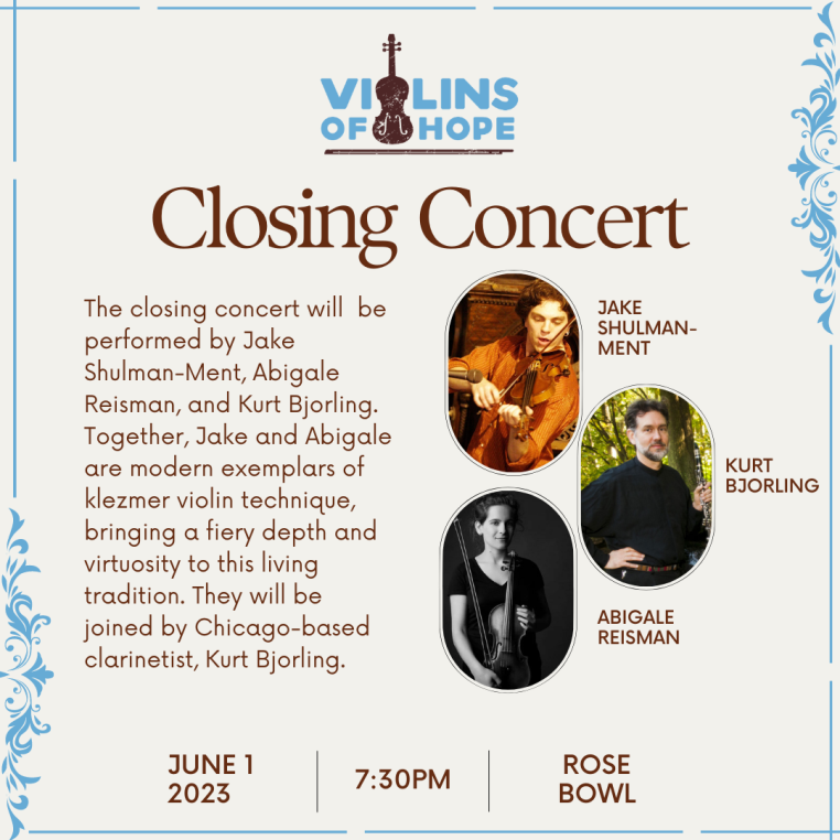 What: The closing concert for Violins of Hope will be performed by world-famous klezmer musicians Jake Shulman-Ment, Abigale Reisman, and Kurt Bjorling!