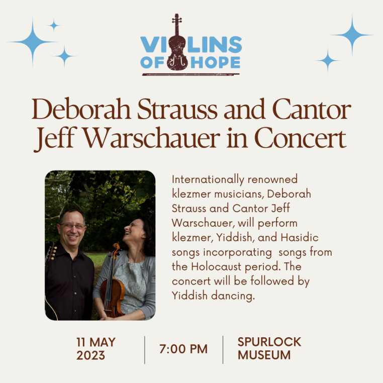 What: Internationally renowned klezmer musician Deborah Strauss (violin, accordian, vocals, dance) and Cantor Jeff Warschauer (guitar, mandolin, vocals) are sweet and soulful performers who draw from klezmer, Yiddish, Hasidic, and liturgical music and culture, adding their own original compositions and song settings. Their music is grounded in tradition, yet thoroughly contemporary. For this concert, they will also incorporate songs from the Holocaust period as well as songs about violins. The concert will be followed by Yiddish dancing with music and dance leading provided by Jeff, Deborah, Mitch Harris, and members of Urbana's Papashoy Klezmer Band.
